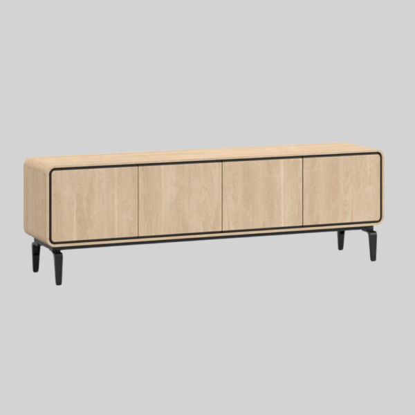 Le bahut LAGO DR2 K840BL, finition chêne beige et pieds métal, offre 4 portes pour un rangement généreux sur 215cm, alliant design épuré et style contemporain.